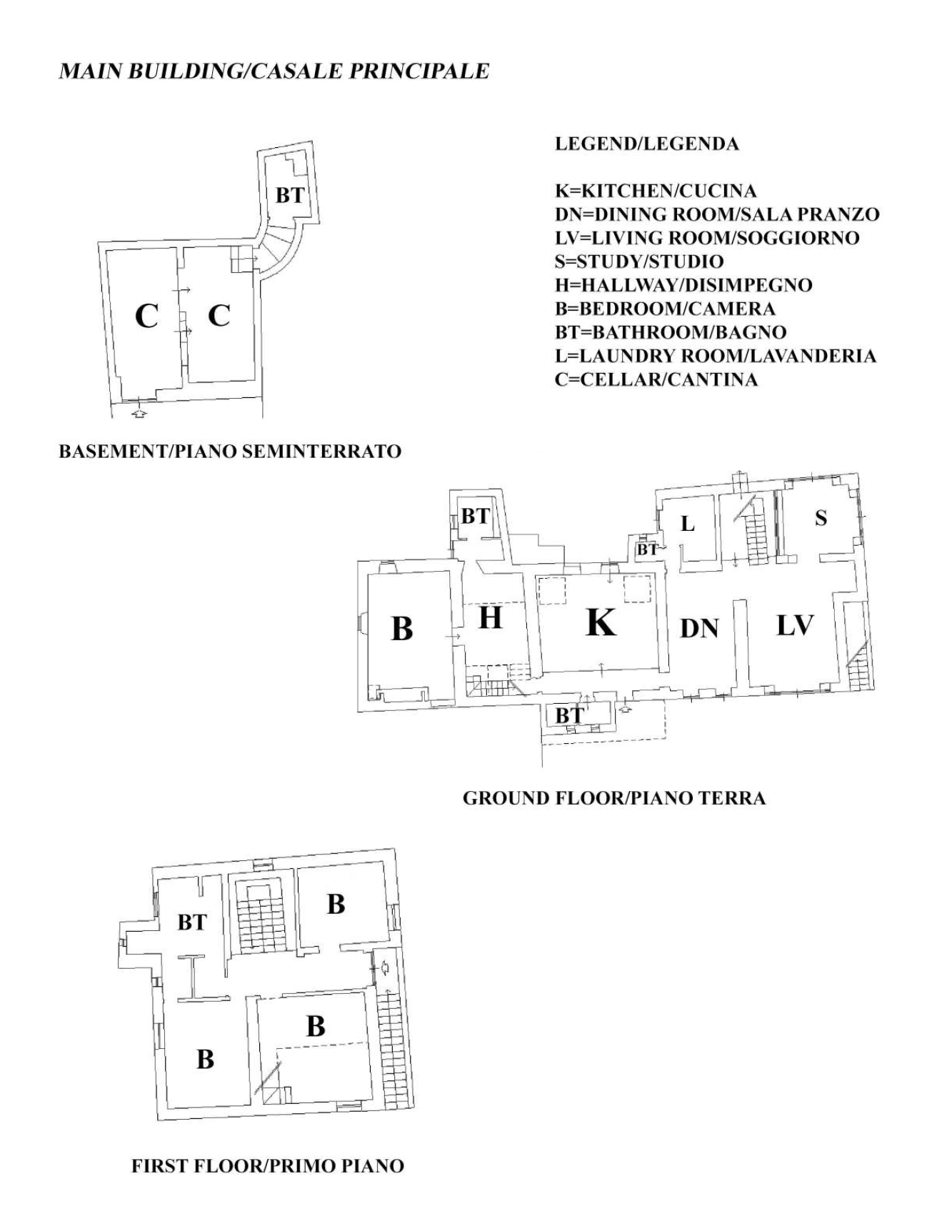 The first floor hosts three bedrooms, one of which features a mezzanine, and an additional bathroom. The property is completed by a semi-basement level with a summer lounge with bathroom and library, ideal for conversion into a modern wellness area, gym, or winter garden, as well as original stone cellars and a technical room.