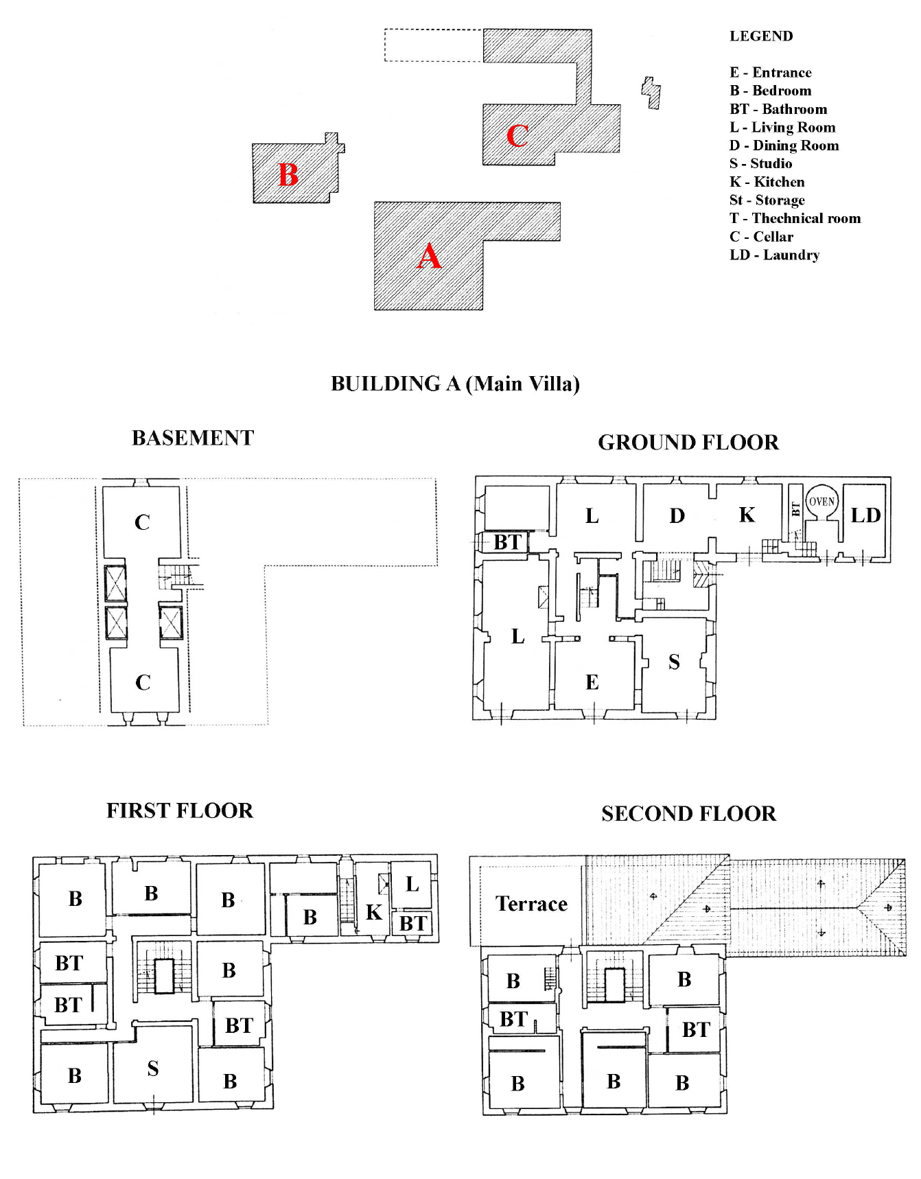 The villa, spanning approximately 400 sqm, is spread over 4 levels and is currently fully renovated. The basement features a cellar, while the ground floor includes a spacious living area. The sleeping quarters are located on the first and second floors. The villa comprises 12 rooms and 8 bathrooms in total.