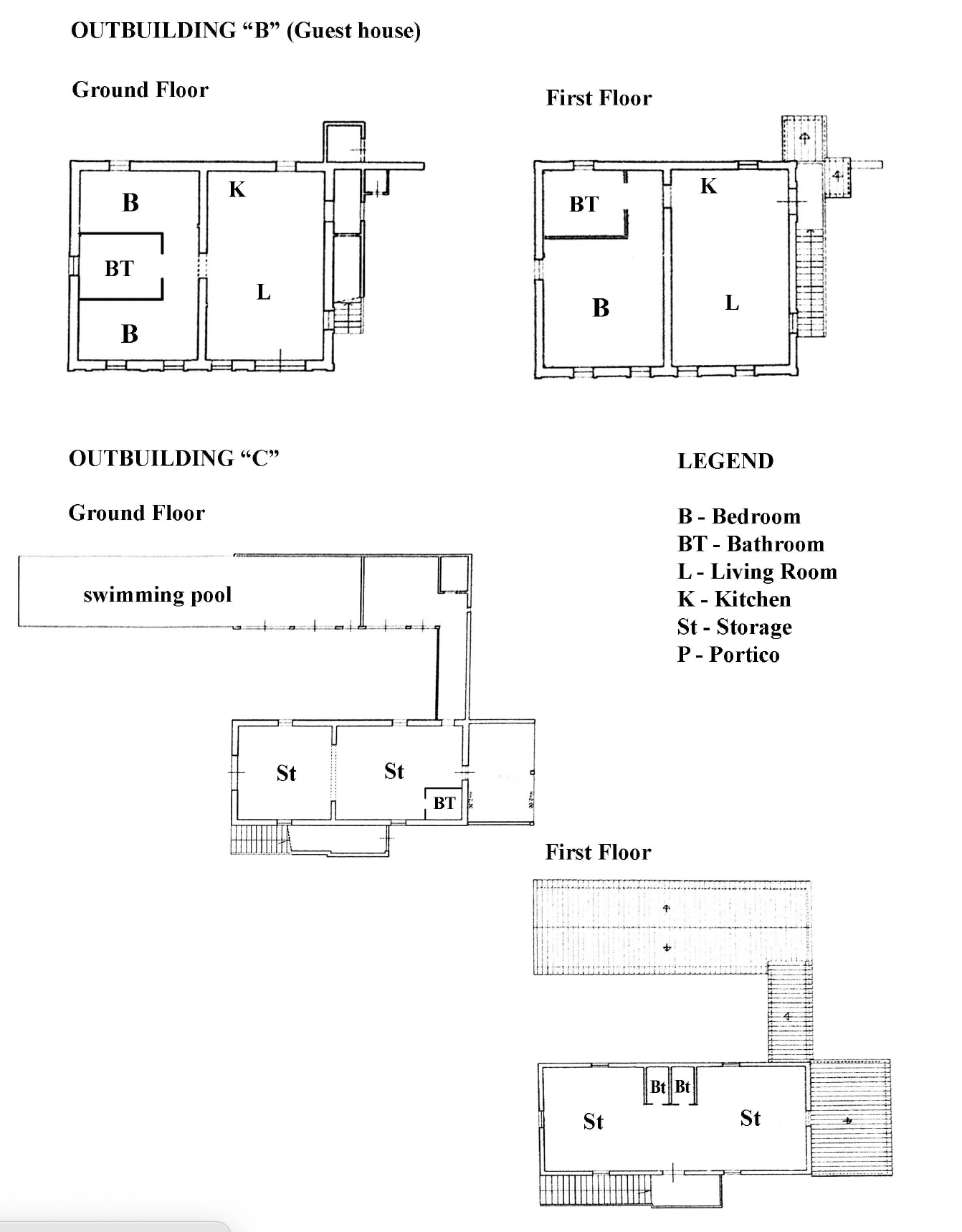 Included in the property is also a 200 sqm guesthouse, arranged over 2 levels and divided into two apartments. One apartment features a kitchen-living room, 2 bedrooms, and 1 bathroom; the other includes a kitchen-living room, 1 bedroom, and a bathroom. Additionally, the property includes a 200 sqm brick building on two levels, restored and currently used as a storage warehouse.