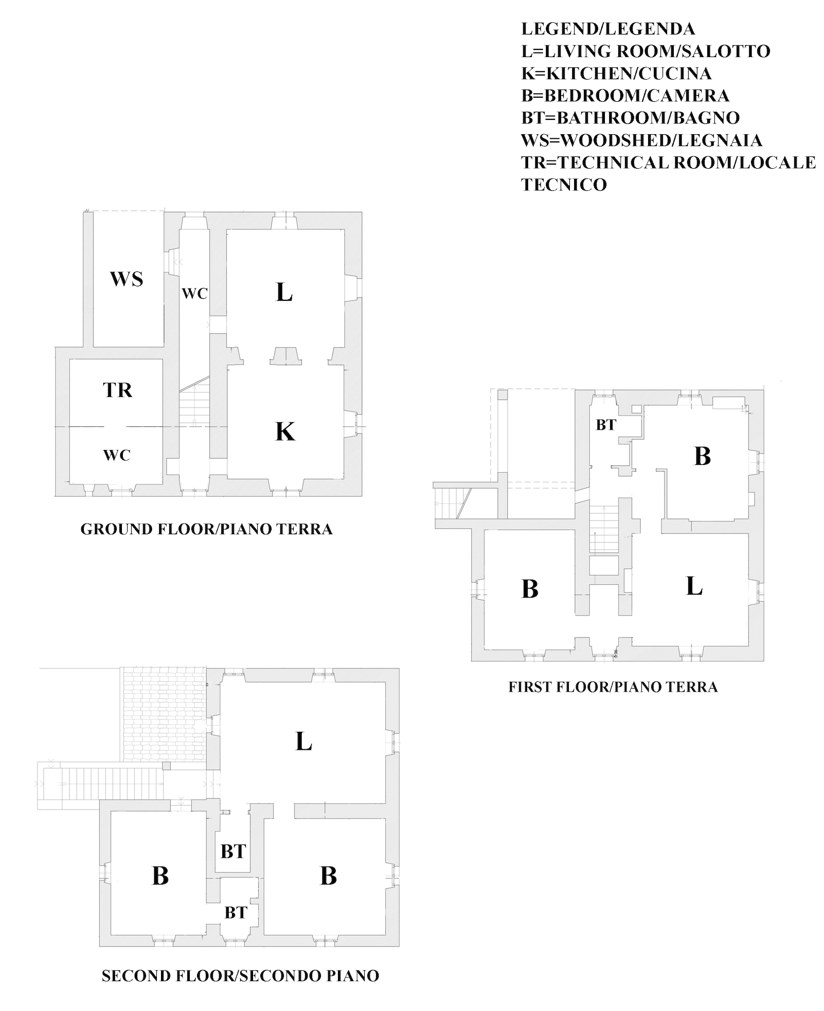 The main unit is arranged over the ground and first floors. On the ground floor there is a kitchen with direct access to the outside, a living room, a WC, and a technical room. From the kitchen, you can access the garden, where a large table provides the perfect setting for outdoor lunches and dinners.